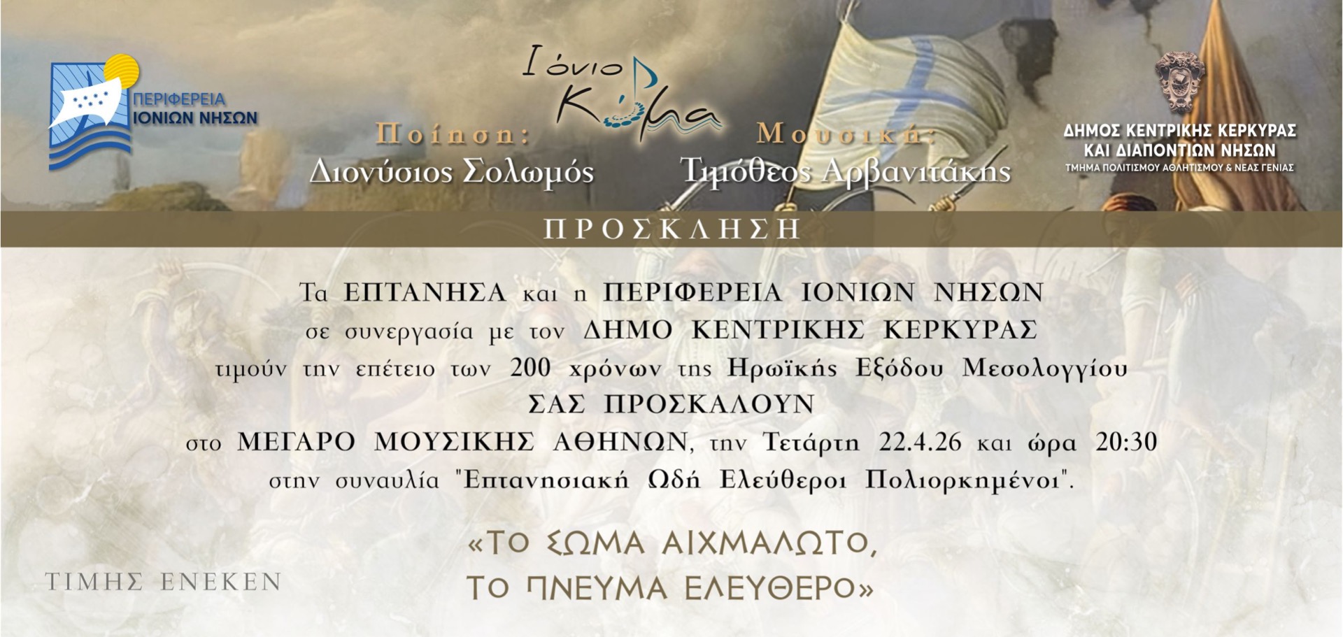 Ο Πρόεδρος και τα μέλη της Επτανησιακής Συνομοσπονδίας έχουν την τιμή να σας προσκαλέσουν στη συναυλία που θα πραγματοποιηθεί στο Μέγαρο Μουσικής Αθηνών, την Τετάρτη 22 Απριλίου 2026 και ώρα 20:30, με τίτλο «Επτανησιακή Ωδή – Ελεύθεροι Πολιορκημένοι».